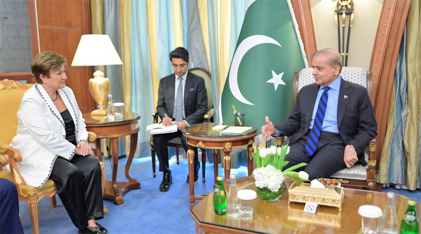 Riyadh : Prime Minister Shehbaz Sharif expresses the committed to put Pakistan’s economy back on track through structural reforms, strict fiscal discipline and prudent policies to ensure macro-economic stability and sustained economic growth.He was talking to Managing Director of the International Monetary Fund Ms Kristalina Georgieva, on the sidelines of the World Economic Forum Special Meeting in Riyadh today.This was the first meeting between the Prime Minister and the Managing Director IMF since his re-election. They last met in Paris in June last year on the margins of the Summit for New Global Financial Pact.The Prime Minister thanked Ms. Georgieva for her support to Pakistan in securing the three billion dollars Standby Arrangement from the IMF last year that is now nearing its completion. The IMF Executive Board is expected to meet tomorrow to decide on the final tranche of 1.1 billion dollars under the Standby Arrangement.The Managing Director of IMF appreciated the leadership of Prime Minister Muhammad Shehbaz Sharif for timely securing the Standby Arrangement last year.Both sides also discussed Pakistan entering into another IMF program to ensure that the gains made in the past year are consolidated and its economic growth trajectory remains positive.The Managing Director shared her institution’s perspective on the ongoing program with Pakistan, including the review process.Shehbaz Sharif also extended a cordial invitation to the Managing Director IMF to visit Pakistan at her convenience.