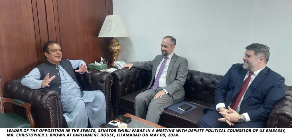 Islamabad : Christopher J. Brown, Deputy Political Counselor of the American Embassy, held meeting with Senator Shibli Faraz, the Leader of the Opposition in the Senate, at Parliament House. They also exchanged views on Pakistan-US relations, economic and political situation and matters of bilateral significance.