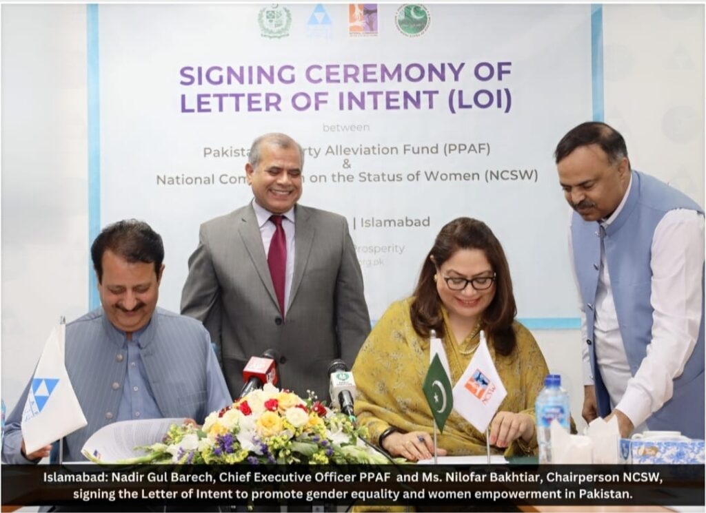 Islamabad : the Pakistan Poverty Alleviation Fund (PPAF) and the National Commission on the Status of Women (NCSW) have entered into a strategic partnership, marking a significant milestone in Pakistan’s journey towards gender equality and economic empowerment. This alliance reflects a joint effort to harness the potential of women as catalysts for change. Signing a Letter of Intent (LOI) in Islamabad, CEO PPAF Nadir Gul Barech and NCSW Chairperson Ms. Nilofar Bakhtiar were the signatories of