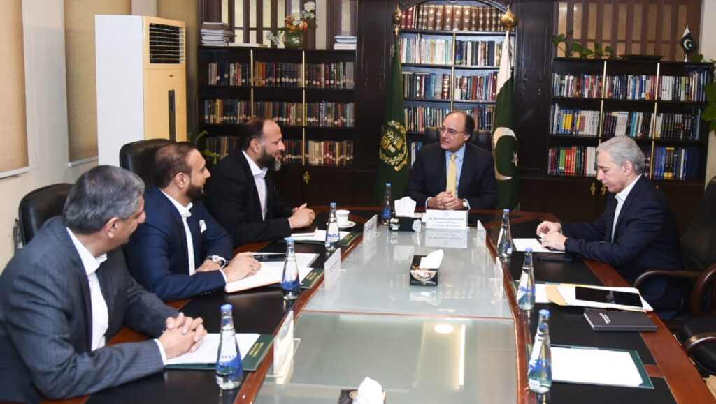 Islamabad : CEO K-Electric Syed Moonis Abdullah Alvi accompanied by CFO KE Muhammad Aamir Ghaziani and Chief Regulatory Affairs Muhammad Imran Qureshi called on Federal Minister for Finance and Revenue Senator Muhammad Aurangzeb at Finance Division.