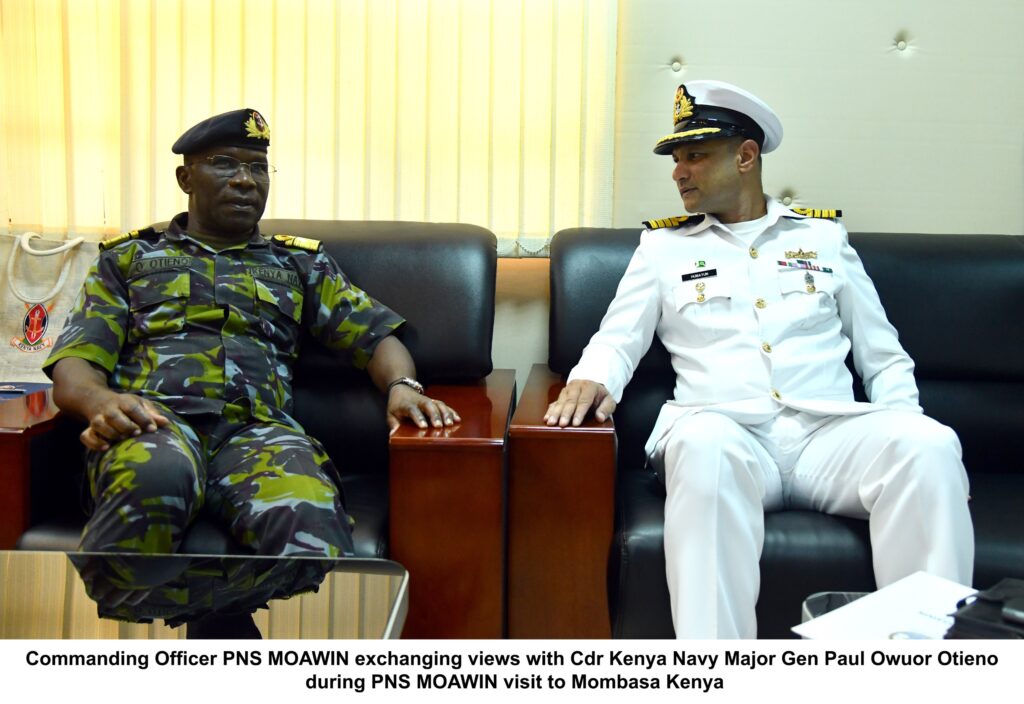 During the port visit, the Commanding Officer of PNS MOAWIN met Commander Kenya Navy, Major General Paul Owuor Otieno, and other local government officials to discuss matters of mutual interest and explore avenues for enhancing bilateral cooperation. The Commanding Officer conveyed good wishes of Chief of the Naval Staff, Admiral Naveed Ashraf, to the people of Kenya and expressed gratitude for the support extended by host Navy and local Pakistani community.