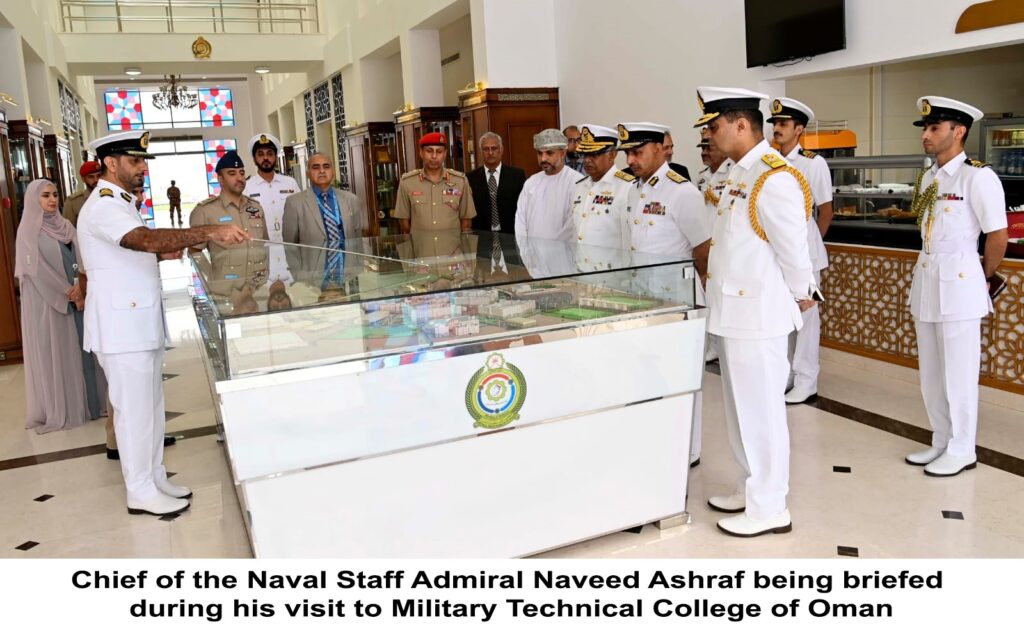 Islamabad : Chief of the Naval Staff, Admiral Naveed Ashraf, called on the top military and naval leadership of Oman during an official visit. He held separate meetings with the Minister of Royal Office, General Sultan Mohammad Al Nu’amani, the Commander of Royal Navy of Oman, Rear Admiral Saif Nasser Al Rahbi, and the Commander of National Defence College, Rear Admiral Ali Abdullah Al Shidi.