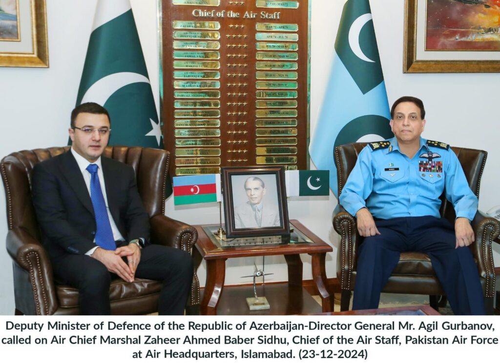 Rawalpindi : A high level defence delegation led by Deputy Minister of Defence of the Republic of Azerbaijan-Director General Mr. Agil Gurbanov, alongwith Lieutenant General Namig Islamzade, Deputy Minister of Defence-Commander of the Azerbaijan Air Force called on Air Chief Marshal Zaheer Ahmed Baber Sidhu, Chief of the Air Staff, Pakistan Air Force at Air Headquarter.