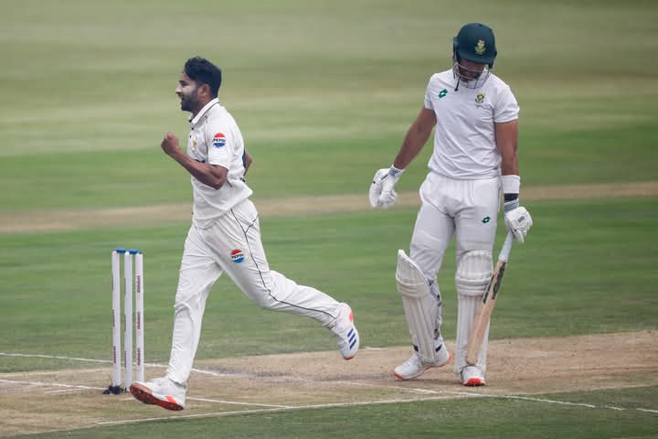 South Africa 301 all out, 73.4 overs (Aiden Markram 89, Corbin Bosch 81 not out, Temba Bavuma 31, David Bedingham 30; Khurram Shahzad 3-75, Naseem Shah 3-92, Aamir Jamal 2-36).