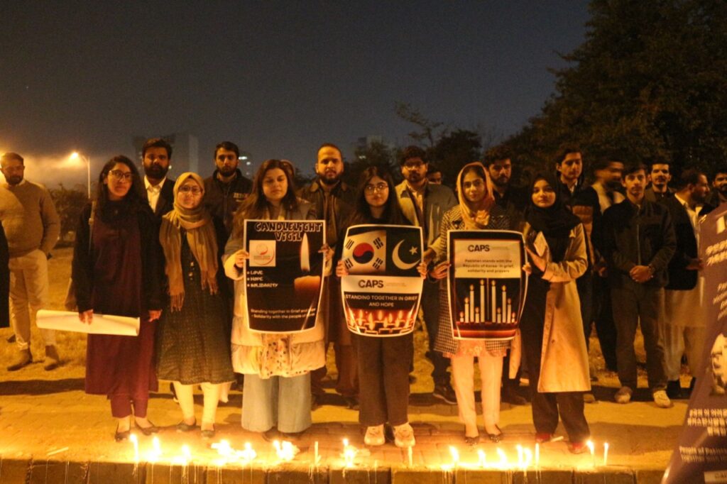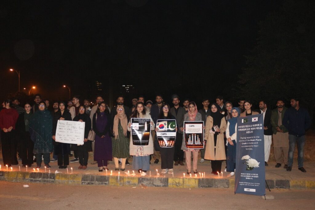 ISLAMABAD: – Dr. Muhammad Shoaib, Senior Vice President of CAPS, during his speech at the vigil. “On behalf of the Consortium for Asia Pacific Studies, Pakistan, I extend our deepest condolences to the families, friends, and loved ones of all those who perished in this tragic accident. Our vigil tonight is a testament to our solidarity. We stand shoulder-to-shoulder with our friends in South Korea as they navigate this difficult time.”