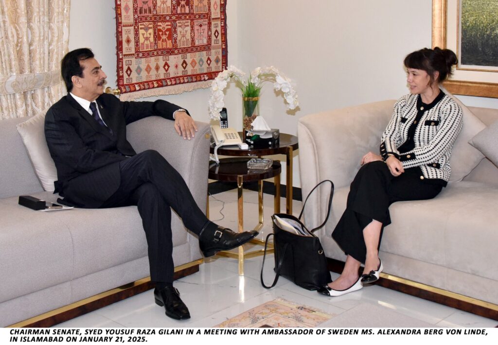 Islamabad :- Chairman Senate Syed Yousaf Raza Gilani has reiterated Pakistan’s commitment to further strengthening its bilateral relationship with Sweden, based on mutual respect, shared values, and common goals. He expressed these views in meeting with Ambassador of Sweden Alexandra Cannell Berg von Linde.