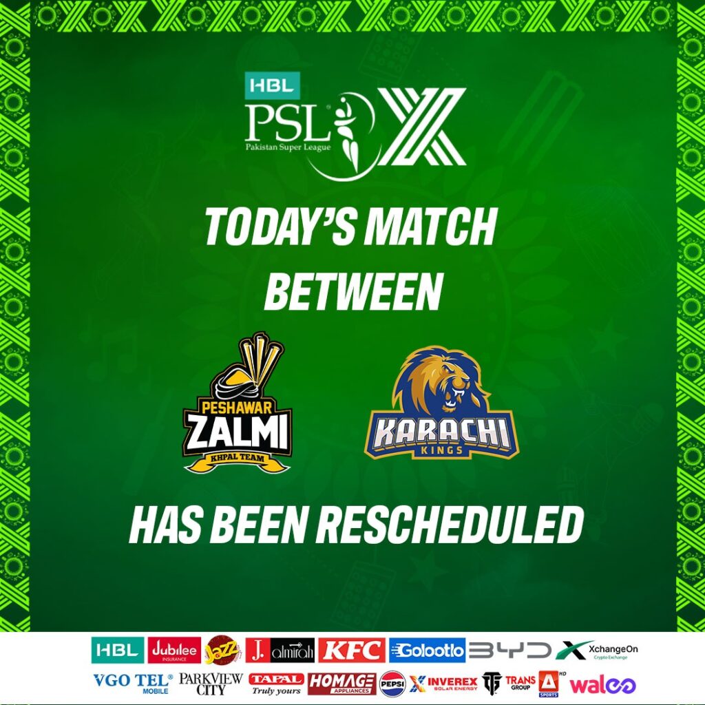 Rawalpindi : The Pakistan Cricket Board, in consultation with all the stakeholders, has decided to reschedule tonight’s HBL PSL X match between Peshawar Zalmi and Karachi Kings.