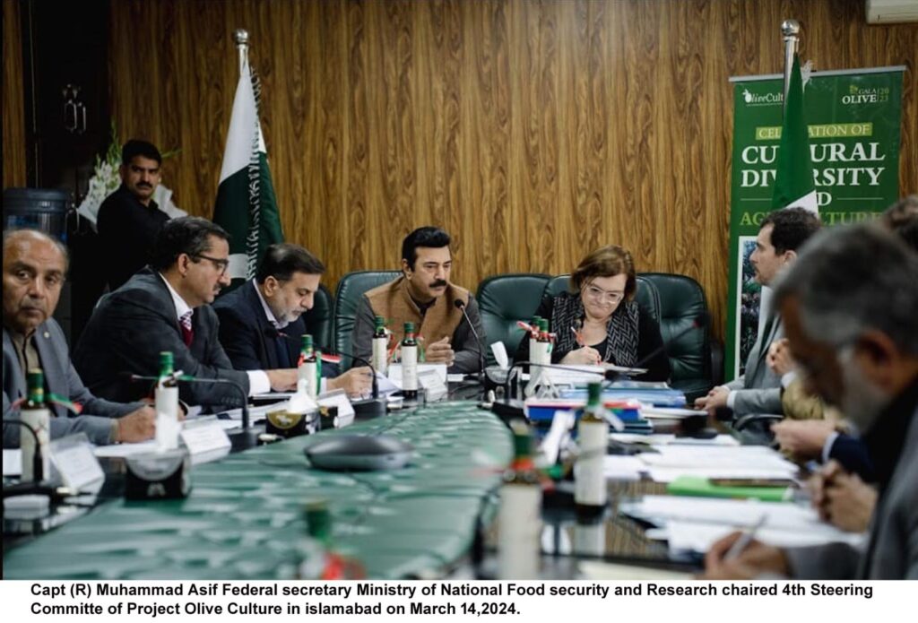 Islamabad – The 4th Steering Committee meeting for the “OliveCulture – Holistic and Multiprofessional Mechanism for a Pakistani Olive Oil Value Chain” Project convened, marking another significant step towards enhancing Pakistan’s olive sector. Chaired by Capt.(R) Muhammad Asif, Federal Secretary of the Ministry of National Food Security & Research, Government of Pakistan, and co-chaired by Her Excellency Ms. Marilina Armellin, Ambassador of Italy in Pakistan, the meeting served as a platform for strategic discussions and collaborative efforts.